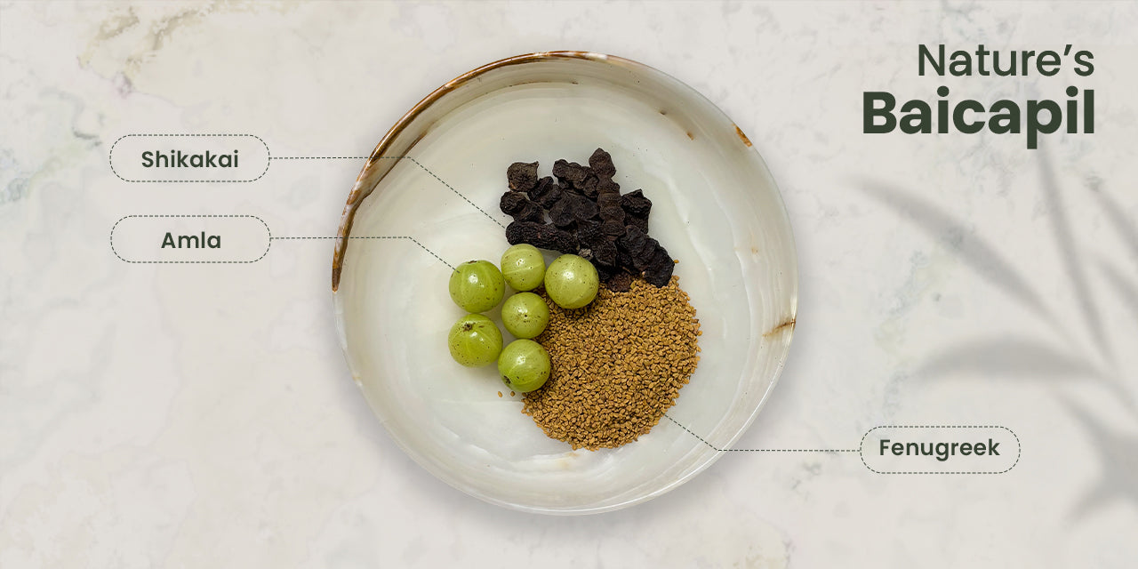 Our Scalp Oil blends Amla, Shikakai, and Fenugreek, traditional Indian herbs that mimic Baicapil’s effects naturally.