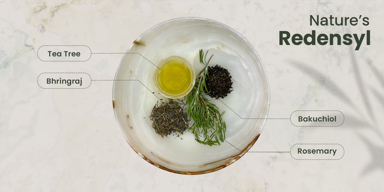 Rosemary, Bhringraj, Bakuchiol, and Tea Tree combine to deliver Redensyl-like benefits without synthetic ingredients.