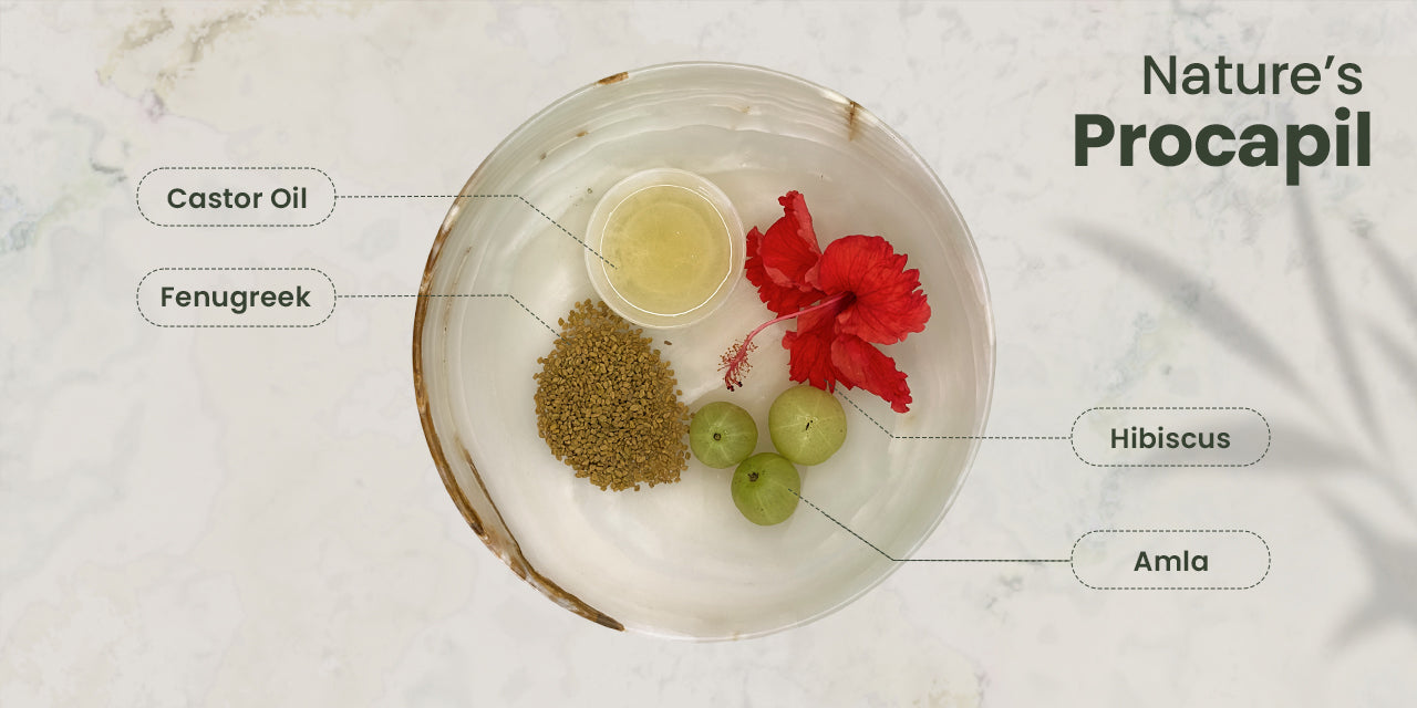 Castor Oil, Hibiscus, Fenugreek, and Amla naturally replicate the effects of Procapil.