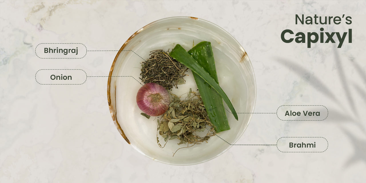 Instead of lab-made Capixyl, we use Onion, Aloe Vera, Brahmi, and Bhringraj, nature’s anti-hair fall blend.